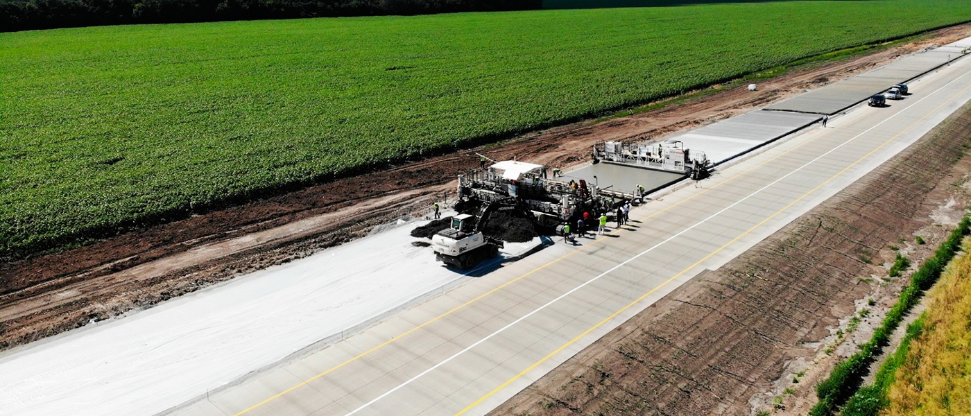 Ми виконуємо весь цикл обслуговування: від підготовки основи до герметизації деформаційних покриттів та загортання швів. На об'єктах використовуємо бетоноукладачі, що забезпечують високу швидкість укладання. Ширина покриття варіюється від 6 до 10 м, а товщина укладеного шару може досягати 50 см. Найчастіше умови не дозволяють розмахнутися настільки широко, тоді на допомогу приходять важкі віброрейки секційного типу.